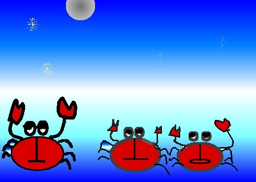 お父さんのかには、遠眼鏡のような両方の目をあらん限りのばして、よくよく見てから言いました。